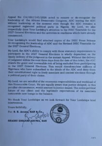 The letter noted that with INEC’s timetable for the 2027 general elections already in motion, the absence of a timely Supreme Court judgment could prevent ADC from meeting statutory requirements needed to participate in the polls.