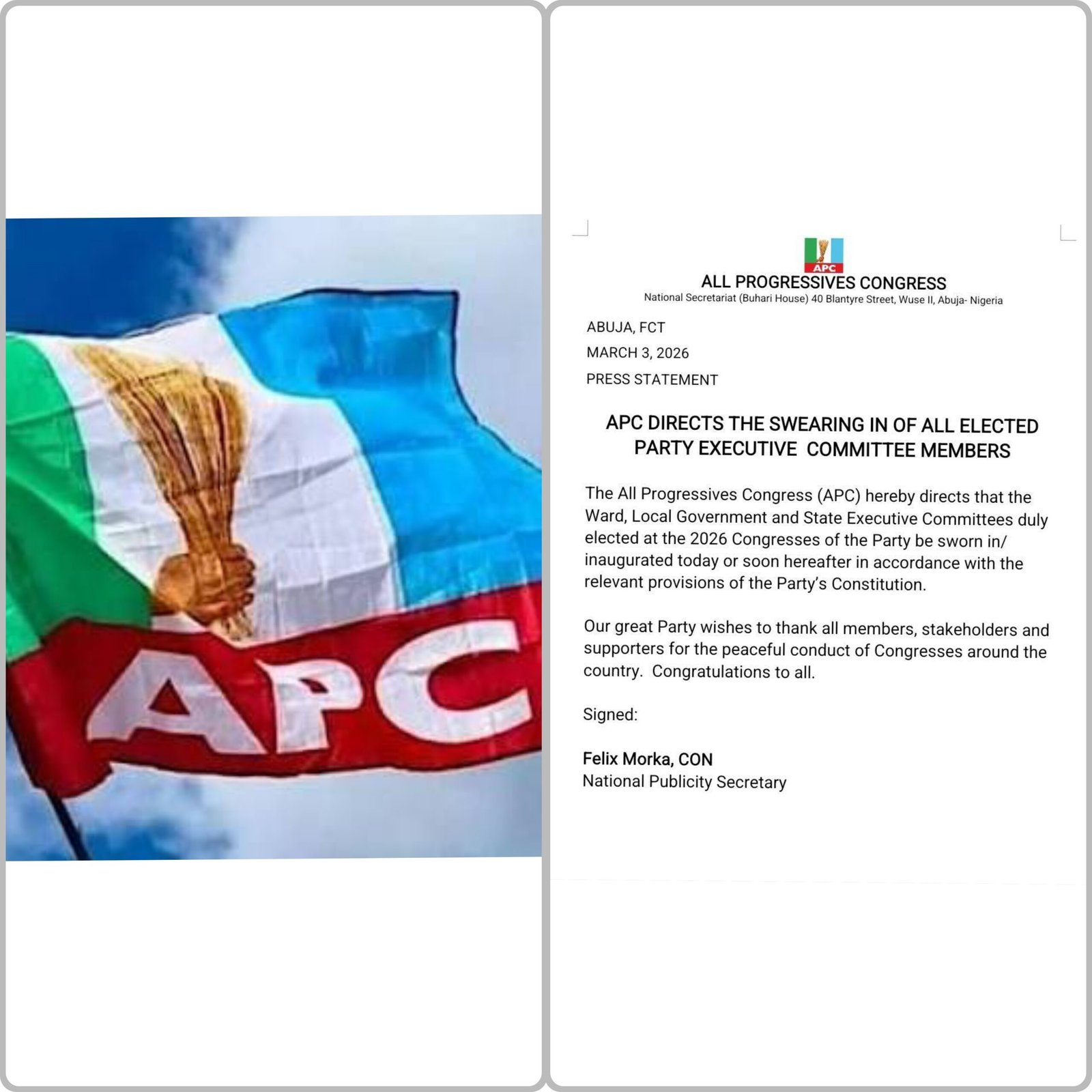 The All Progressives Congress (APC) has directed the immediate swearing-in of all duly elected executive committee members across the country, reinforcing its resolve to strengthen internal party structures and deepen grassroots leadership.