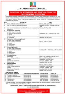 The All Progressives Congress (APC) has officially released its timetable and schedule of activities ahead of the 2027 General Elections.