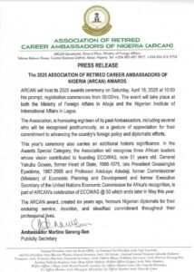 The Association of Retired Career Ambassadors of Nigeria has announced plans to host its 2025 awards ceremony to honour distinguished Nigerian diplomats and notable African leaders for their contributions to diplomacy and regional development.