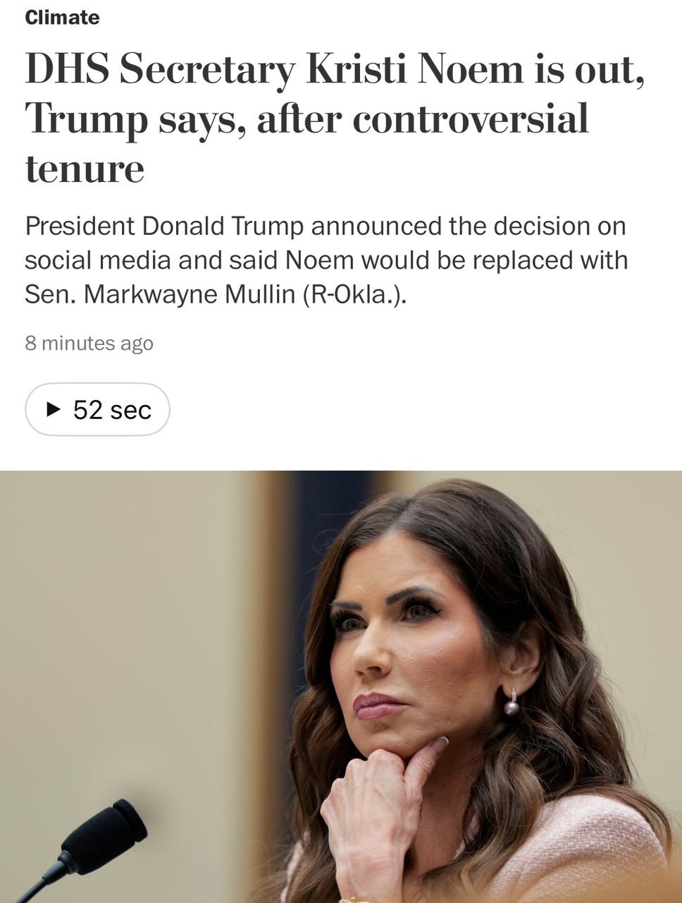 Trump disclosed the decision on Thursday through a social media post, stating that Noem would be succeeded by Markwayne Mullin.