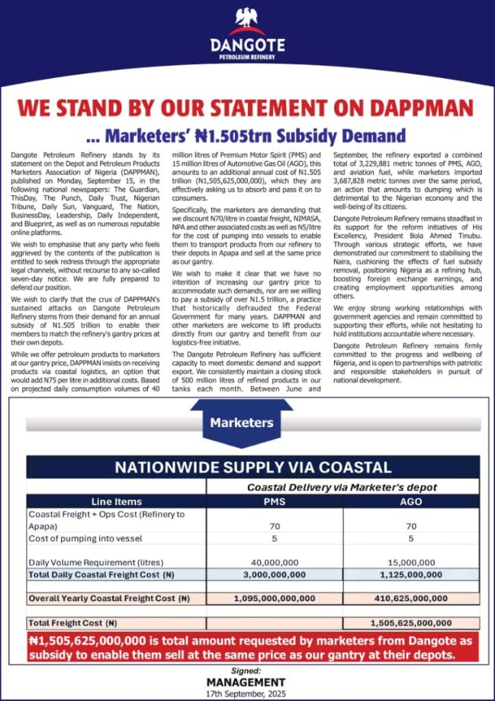The Dangote Petroleum Refinery has rejected a demand by the Depot and Petroleum Products Marketers Association of Nigeria (DAPPMAN) for an annual subsidy of N1.505 trillion to enable members match the refinery’s gantry prices at their depots. The refinery stated DAPPMAN wants the subsidy to cover additional logistics costs of N75 per litre tied to transporting products via coastal logistics from the refinery to marketers’ depots.