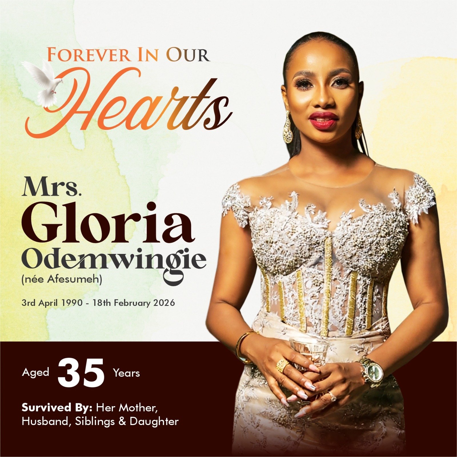 Capital Times News has been thrown into mourning following the death of Mrs. Gloria Odemwingie, daughter-in-law of the Chairman of its Editorial Board, Sir Tommy Odemwingie.