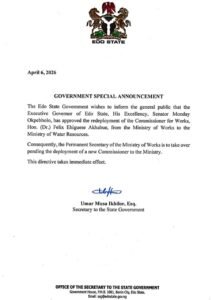 The Edo State Government has approved the redeployment of the Commissioner for Works, Hon. (Dr.) Felix Ehiguese Akhabue, to the Ministry of Water Resources. The directive was authorized by the Executive Governor of Edo State and takes immediate effect, according to an official statement issued by the Secretary to the State Government, Umar Musa Ikhilor, Esq.