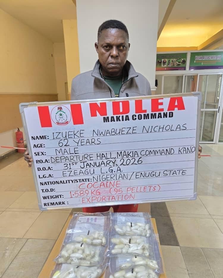 The suspect, Nwabueze Izueke, was arrested at the Mallam Aminu Kano International Airport during the outward clearance of passengers on an Ethiopian Airlines flight bound for China via Addis Ababa, NDLEA spokesperson Femi Babafemi said.