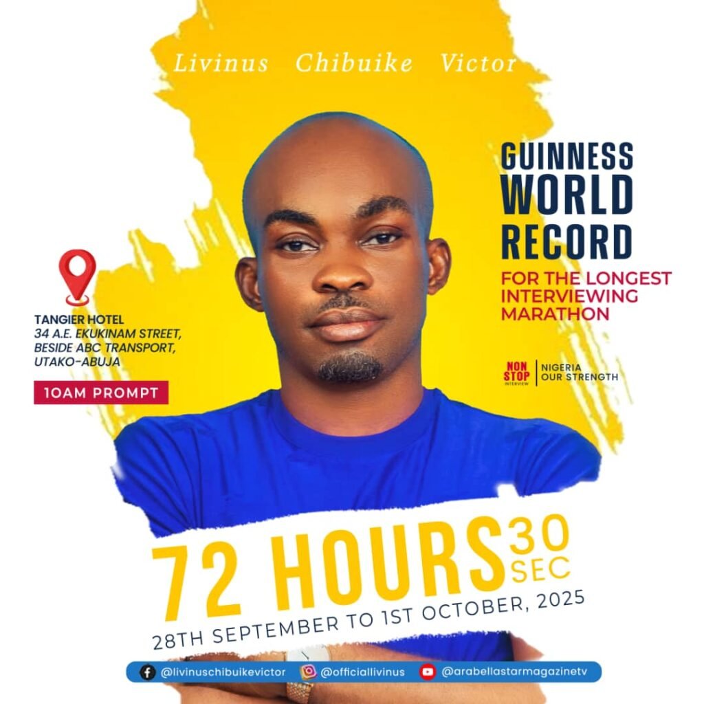 Nigerian-born international journalist Livinus Chibuike Victor is attempting a Guinness World Record for the longest interviewing marathon, themed “NIGERIA OUR STRENGTH”, scheduled from September 28 to October 1, 2025, at Tangier Hotel, Abuja. The event aims to highlight journalism’s role in promoting transparency, challenging power, and giving voice to the voiceless amidst global threats to press freedom.