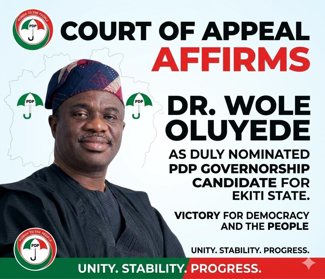 The Court of Appeal sitting in Akure has affirmed Dr. Wole Oluyede as the duly nominated governorship candidate of the Peoples Democratic Party (PDP) for the forthcoming Ekiti State governorship election.