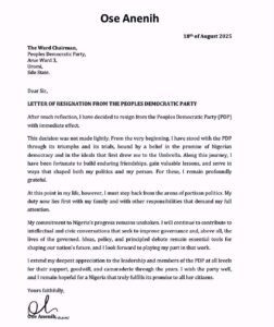 Ose Anenih, son of the late Chief Tony Anenih, a founding member of the Peoples Democratic Party (PDP), has resigned from the party, citing family commitment as the reason for his departure. In a letter dated August 18, 2025, and addressed to the PDP Ward Chairman of Arue Ward 3 in Uromi, Edo State, Anenih explained that his decision followed deep personal reflection and would take effect immediately.