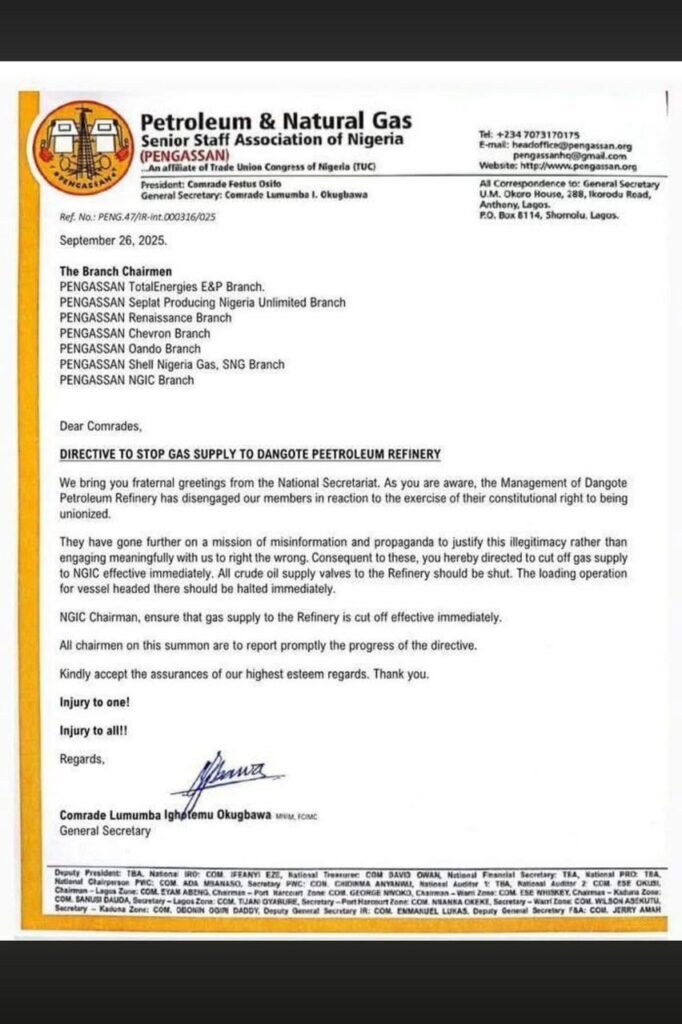The Petroleum & Natural Gas Senior Staff Association of Nigeria (PENGASSAN) has directed its branches to immediately stop gas supply to Dangote Petroleum Refinery following a labour dispute. The association’s General Secretary, Comrade Lumumba Ighotemu Okugbawa, issued the directive in a statement sent to PENGASSAN branch chairmen of various oil and gas companies including TotalEnergies, Seplat, Chevron, and Shell Nigeria Gas.