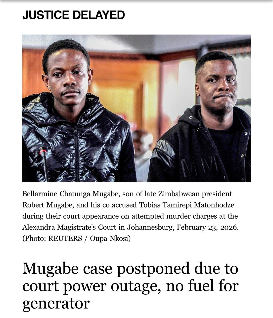 The bail application of Bellarmine Chatunga Mugabe, the 28-year-old son of former Zimbabwean president Robert Mugabe, was on Thursday, March 5, 2026, postponed for the second time due to a power outage at the Alexandra Magistrate’s Court.