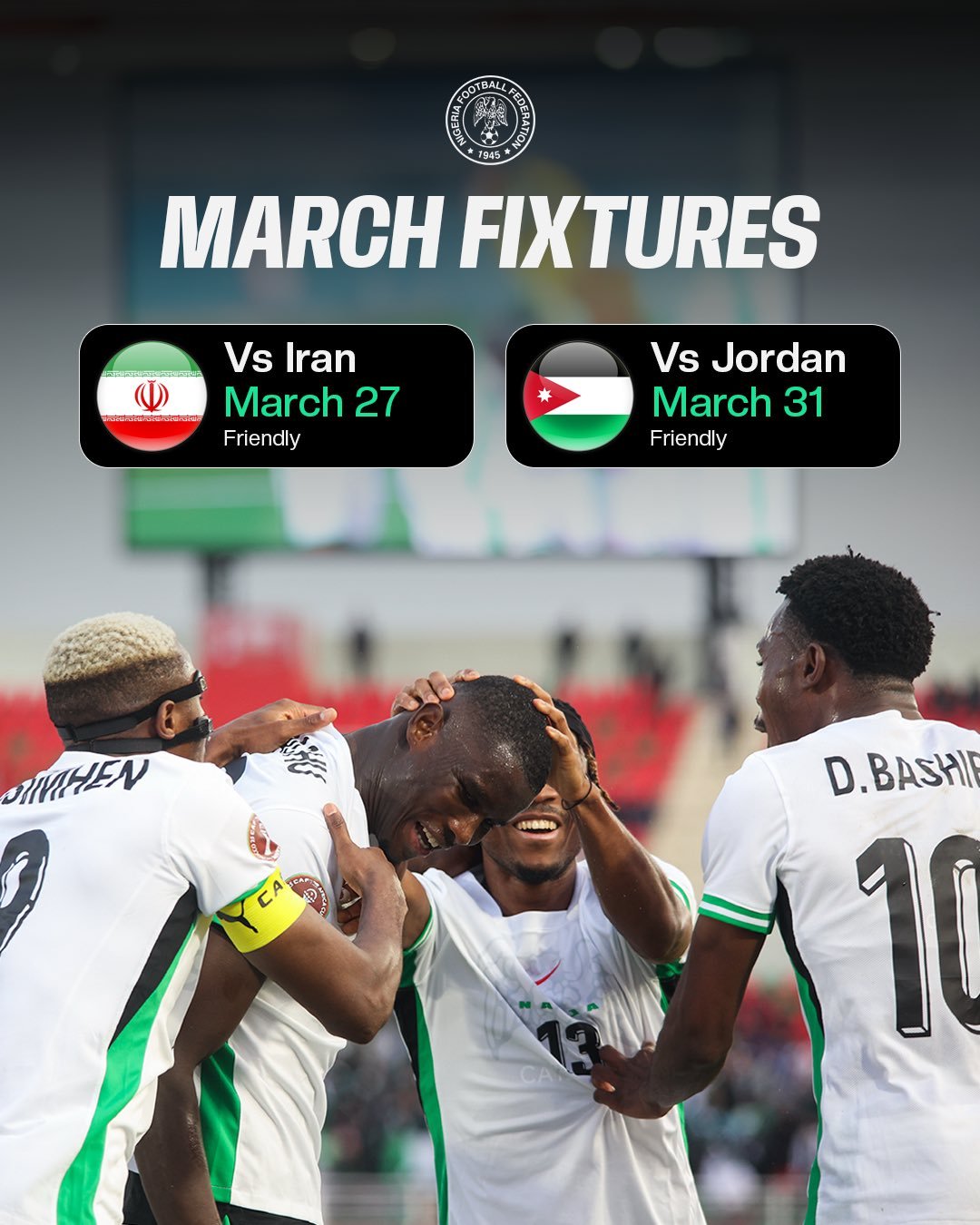 According to the team’s official March fixtures announcement, the Super Eagles will open camp in Amman on March 24. They are scheduled to face Iran on March 27 before taking on hosts Jordan on March 31 in international friendly matches.