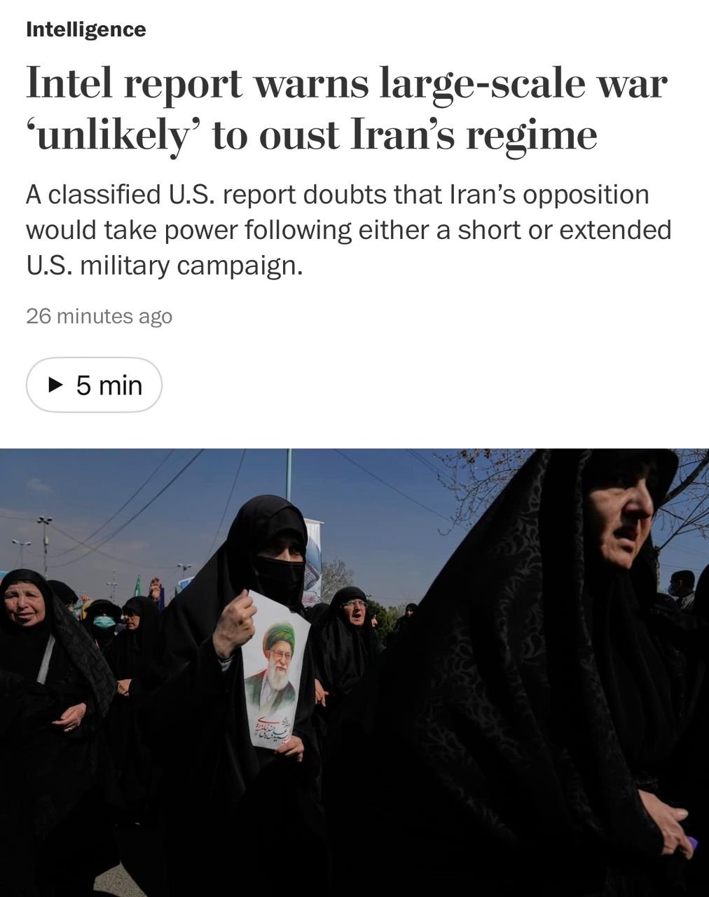A classified assessment by the National Intelligence Council (NIC) has reportedly concluded that even a large-scale military assault on Iran by the United States would be unlikely to dismantle the country’s entrenched clerical and military leadership structure.